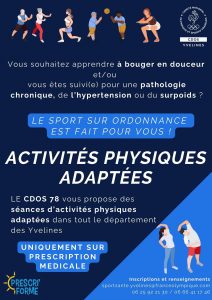 Un certificat médical est obligatoire pour les activités sportives ainsi qu’une paire de chaussures à usage intérieur exclusif pour les activités en salle.Pas de vestiaire, venir en tenue. Tapis personnel pour gym et yoga.